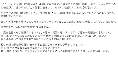 アンケート結果及びご要望事項を真摯に受け止め、職員一同サービスの質の向上を図るべく努力して参ります。今後とも社会福祉法人清明会をよろしくお願い致します。