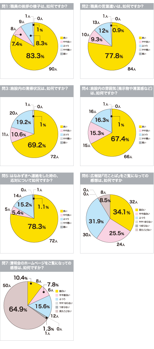 アンケート結果及びご要望事項を真摯に受け止め、職員一同サービスの質の向上を図るべく努力して参ります。今後とも社会福祉法人清明会をよろしくお願い致します。
